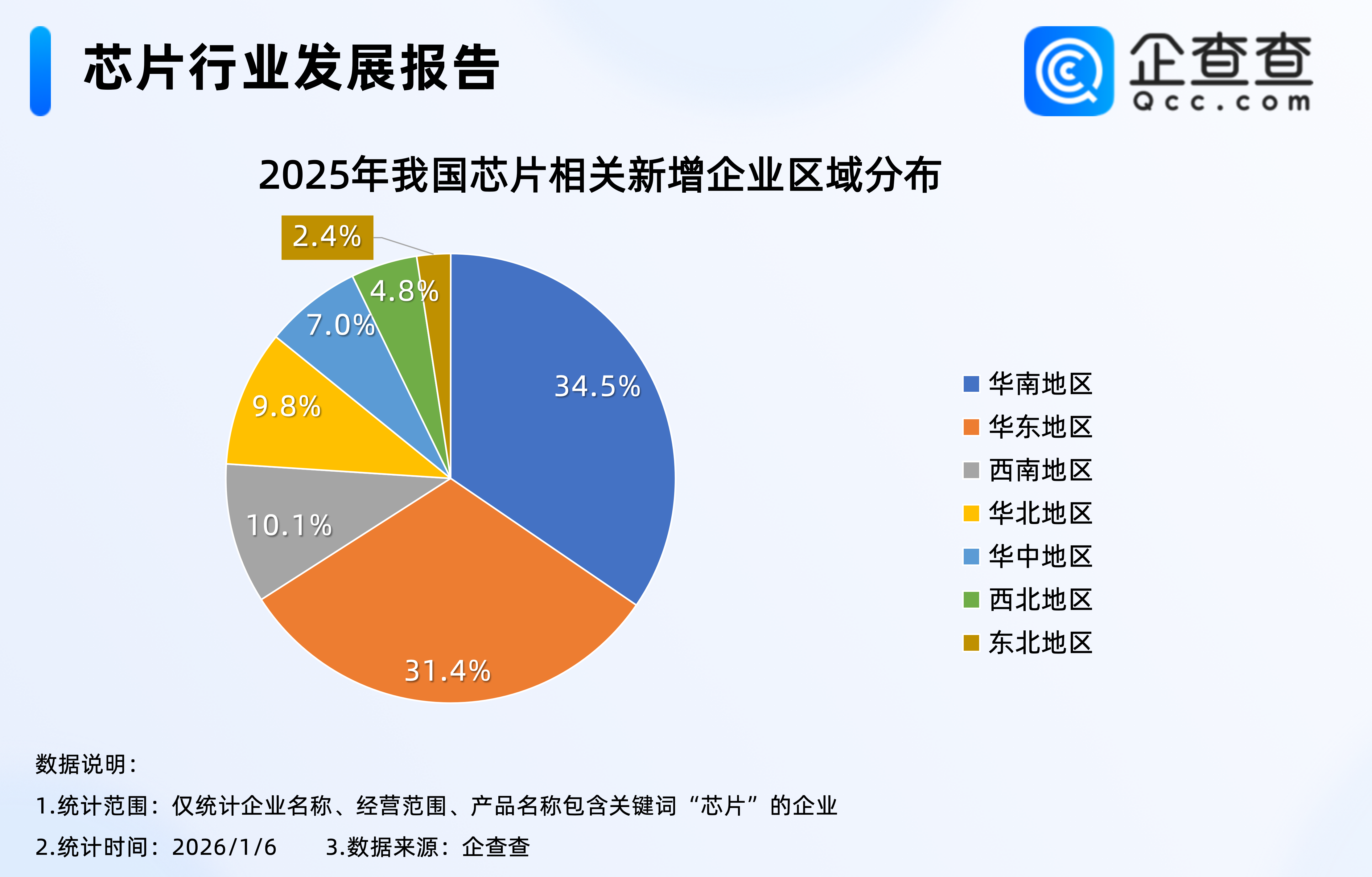 企查查数据显示,近十年,我国芯片相关企业每年注册量基本逐年增加,其中2020年全年注册量同比激增102.4%至2.90万家,达近十年相关企业注册量增速峰值;2025年全年,我国注册8.67万家芯片相关企业,创近十年相关企业注册量新高。2.从区域分布来看:华南地区占比34.5%