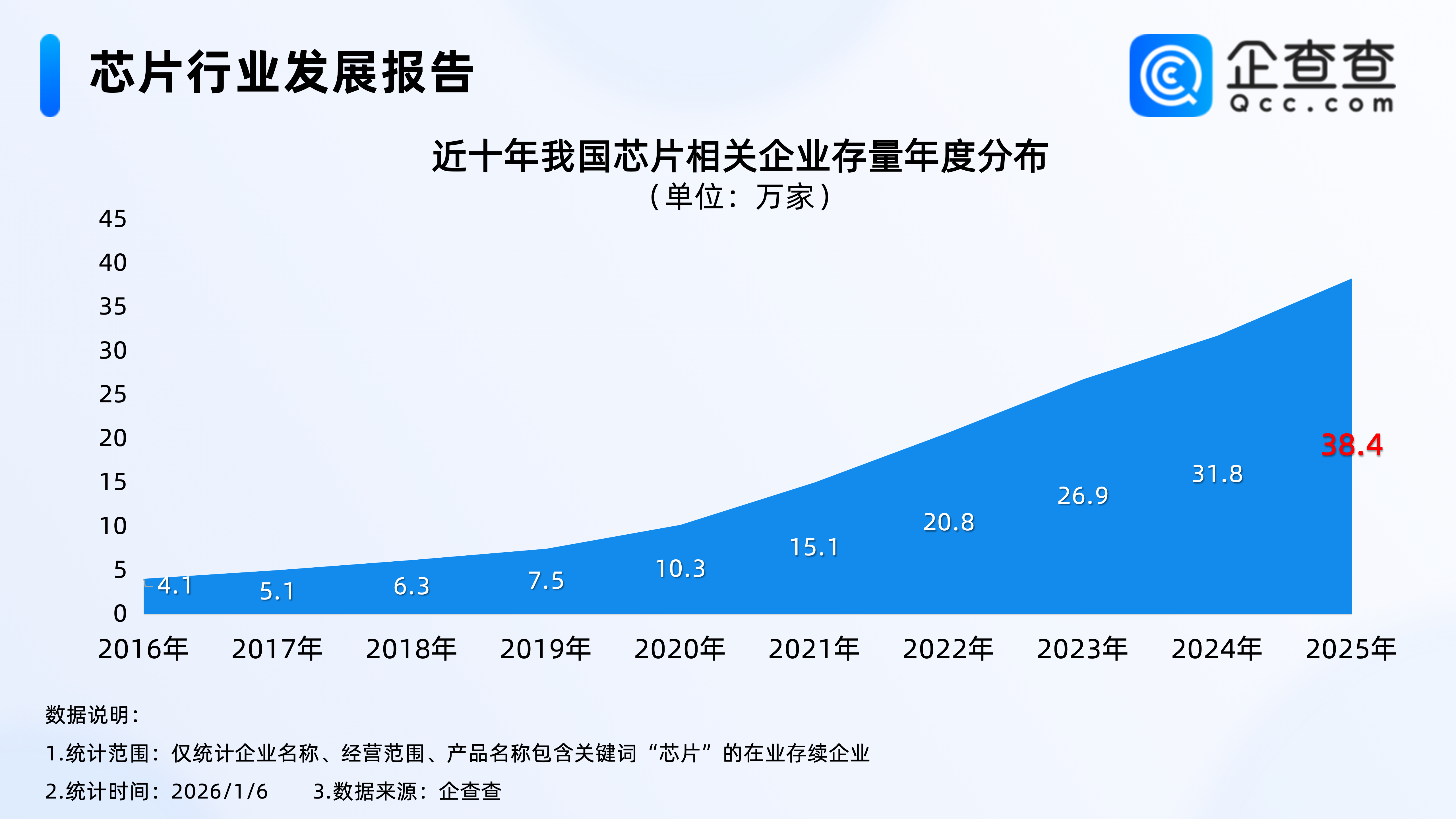 企查查数据显示,近十年,我国芯片相关企业存量逐年稳定增加,2020年开始增速加快,且存量首次突破10万家;截至2025年年底,我国在业存续38.4万家芯片相关企业。
